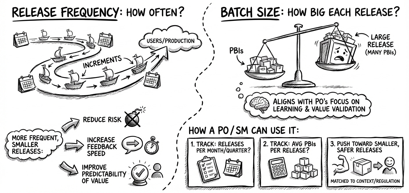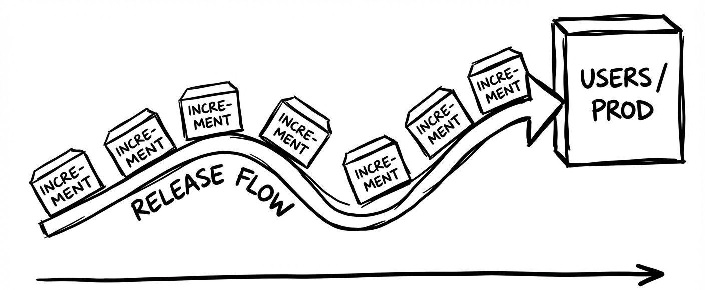 Team adds working agreement: “Release whenever main branch is green. Aim for daily.”