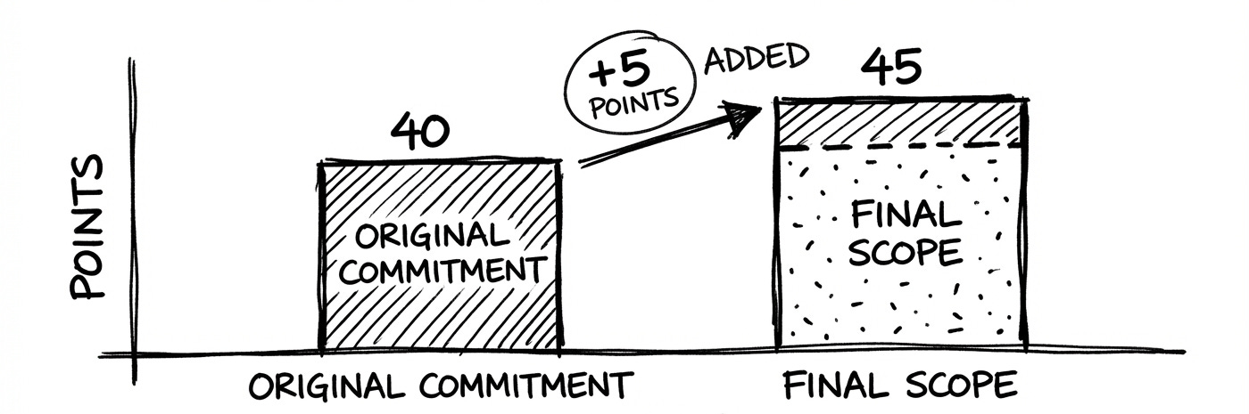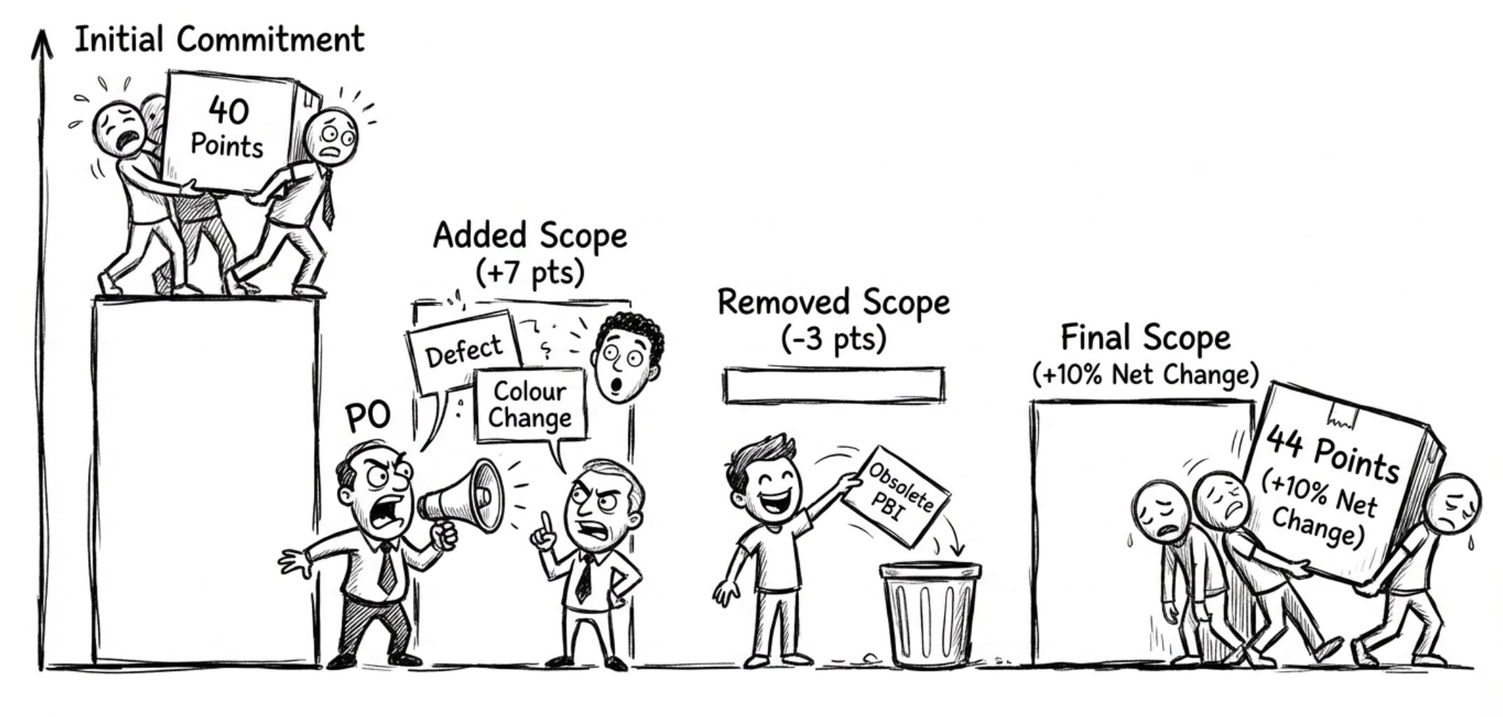 This is the amount of work added, removed, or changed in scope while a sprint is “in progress.”