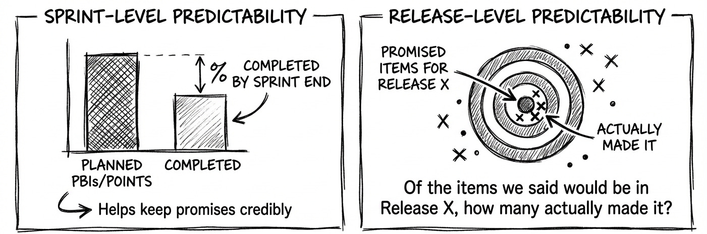 % of planned PBIs completed by the end of the sprint (or planned vs. delivered points)Release-level predictability:
