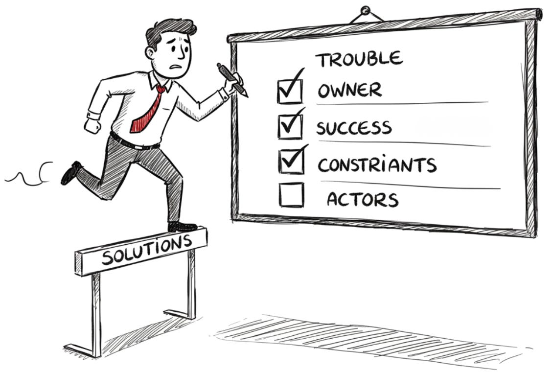 After youâve gathered the facts for each component, i.e. Trouble, Owner, Success, Constraints, Actors, youâre ready to write your core problem statement. This will be your north star. It will keep you focused. It will ensure that every next step, from brainstorming solutions to putting a fix in place, actually matters.