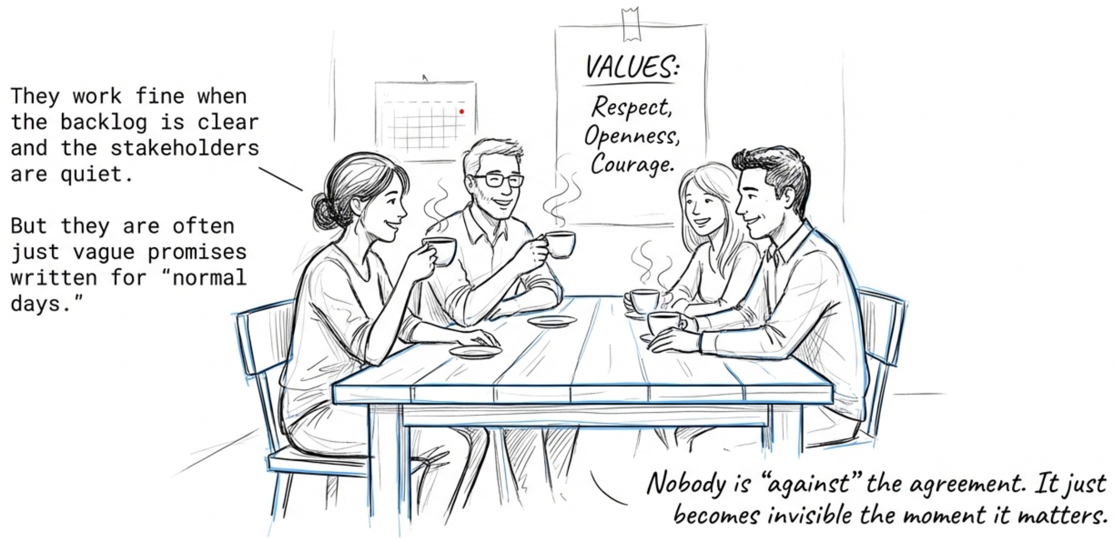 We discussed why, during high-pressure situations, nobody pulls up the agreement. Why teams usually revert to the original manifesto?