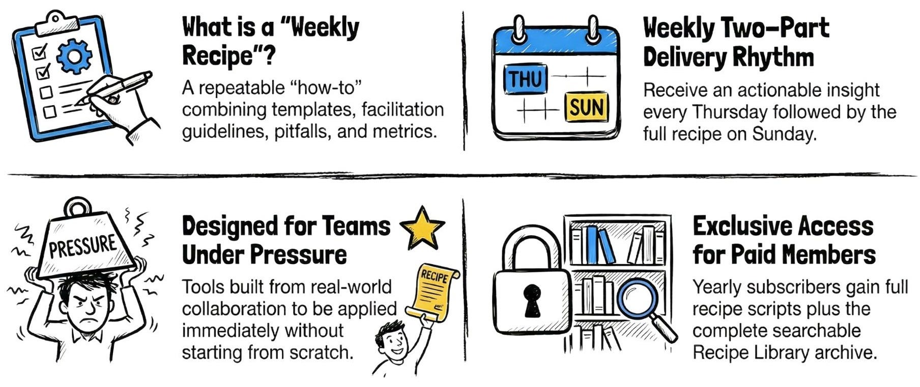 Every week on Sunday, you’ll get a tested, ready-to-use RECIPE that you can apply immediately to your team environment as an Agile Delivery Lead, Scrum Master, or Product Owner.
