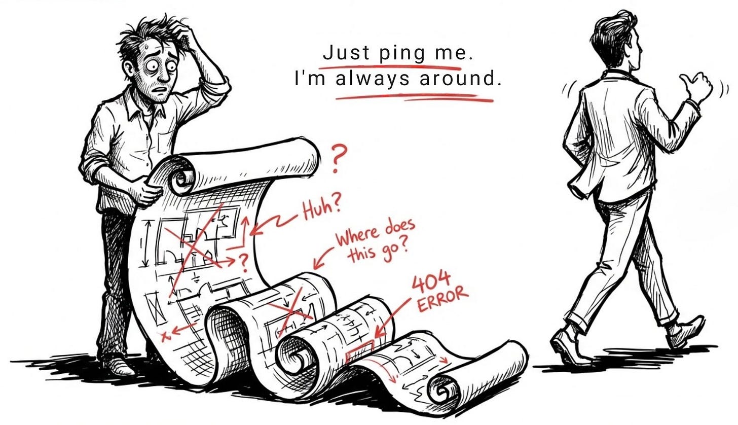 Many questions that appear to be clarifications are actually scope calls, trade-offs, or policy decisions in disguise. And “I’m always available” doesn’t help when the answer requires coordination, not just knowledge.