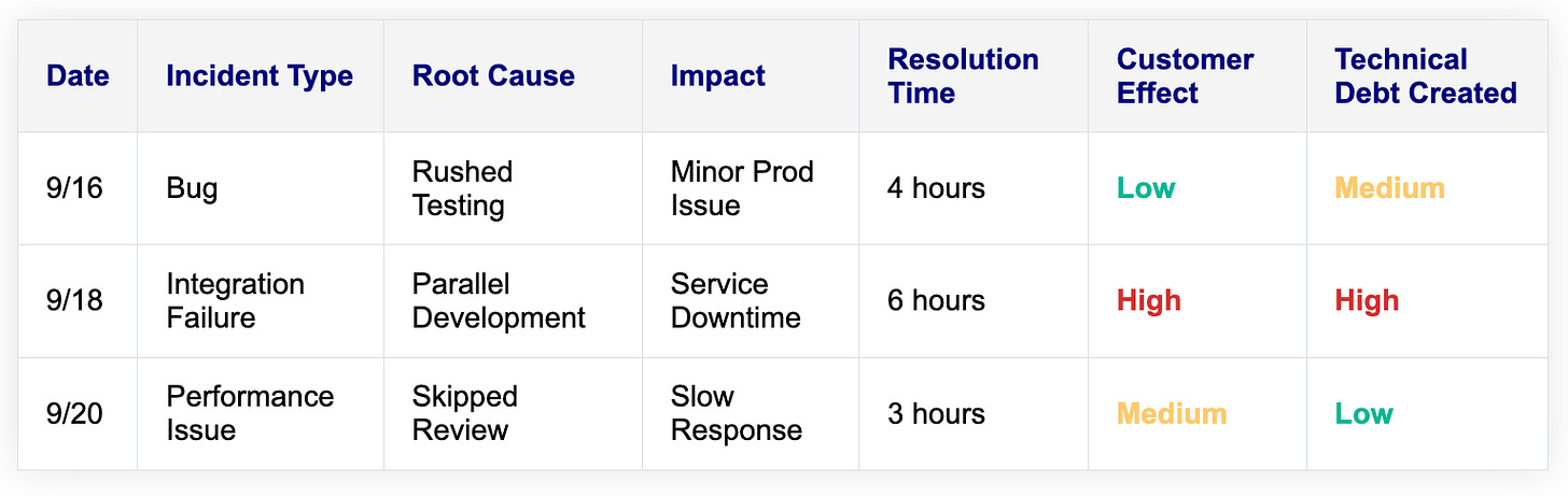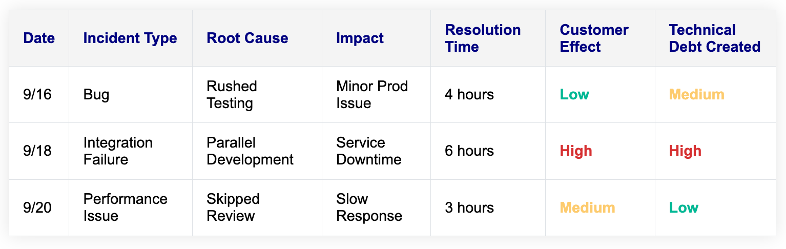Another area of concern was the impact on quality. Aman reviewed the team's recent bug reports and testing logs to identify incidents that could be traced back to rushed or incomplete testing. Things like:
