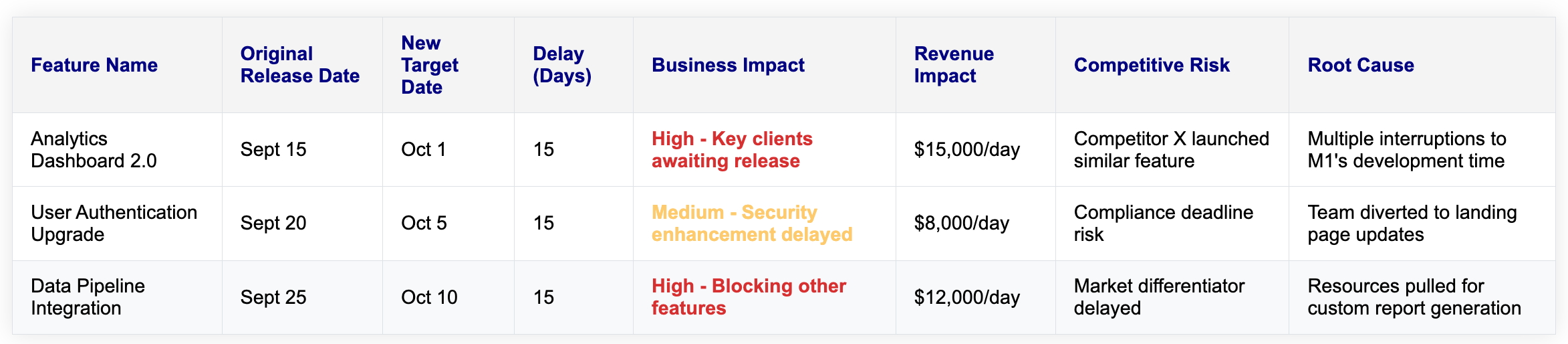 Over the two-week period, three key feature releases were delayed because team members were pulled away to address unplanned work.