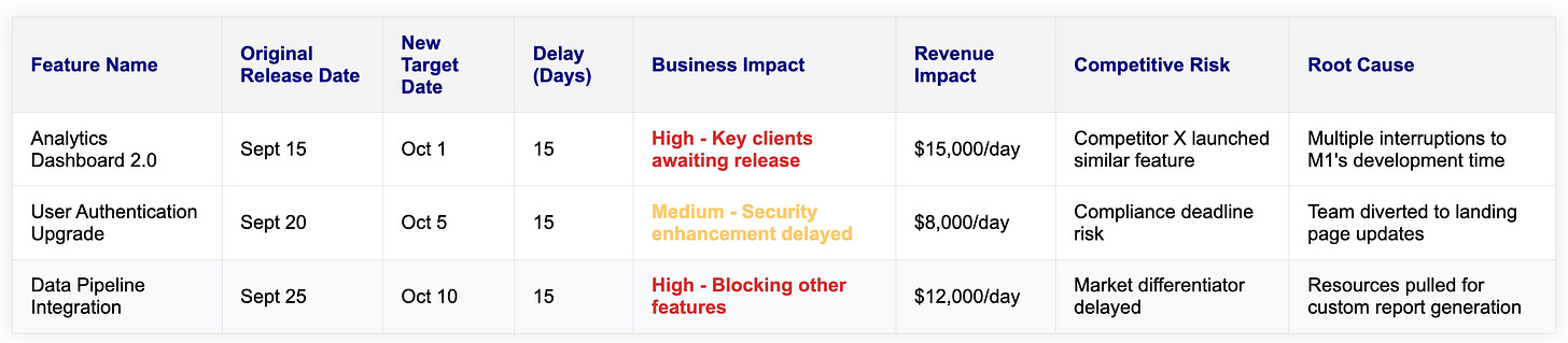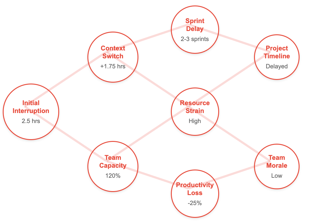 To further illustrate the cost of these interruptions, Aman identified their ripple effects on the team’s planned deliverables.