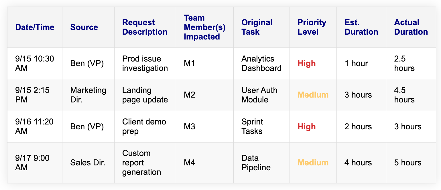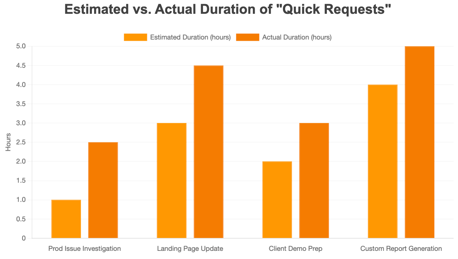 - Team members were pulled away from critical sprint commitmentsMost notably, the data showed that what stakeholders considered "quick requests" routinely took 2-3 times longer than estimated, creating a cascade effect on sprint deliverables.