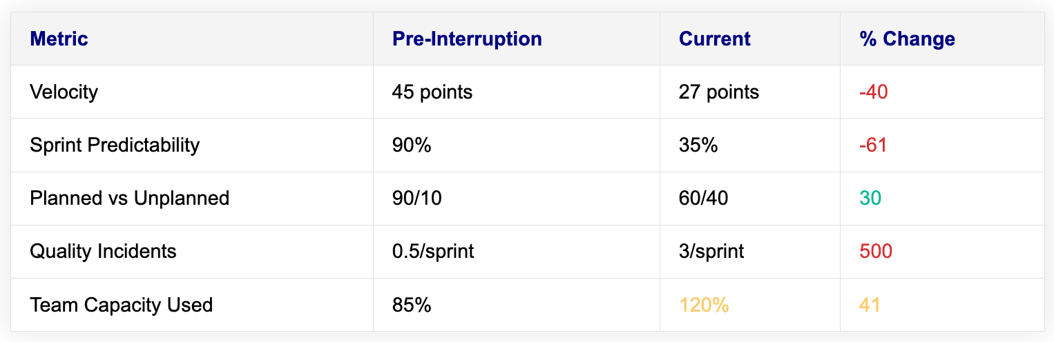 To quantify the full scope of interruption impacts, Aman gathered key Scrum metrics that track team health and performance. These metrics were particularly important because they: