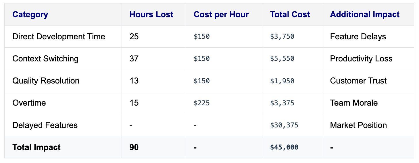 - Direct Costs ($3,750): Development hours lost to unplanned work.