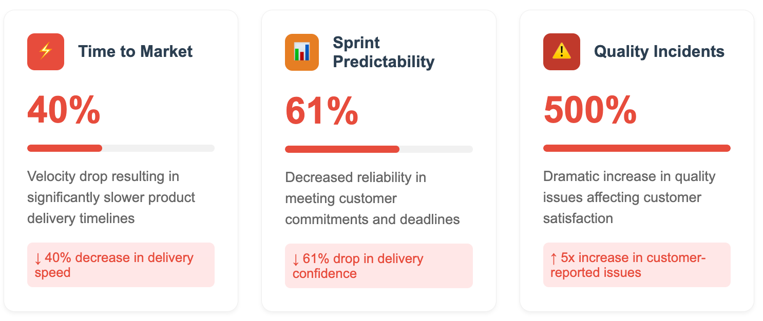 - A 40% velocity drop meant a 40% slower time-to-market.